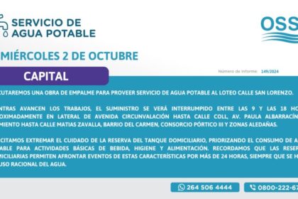 Obras Sanitarias informa que este miércoles 2 de octubre de 2024, llevará a cabo una obra de empalme para incorporar…