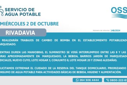 Obras Sanitarias programó, para este miércoles 2 de octubre, realizar trabajos de reemplazo de bomba en el Establecimiento Potabilizador Marquesado.…