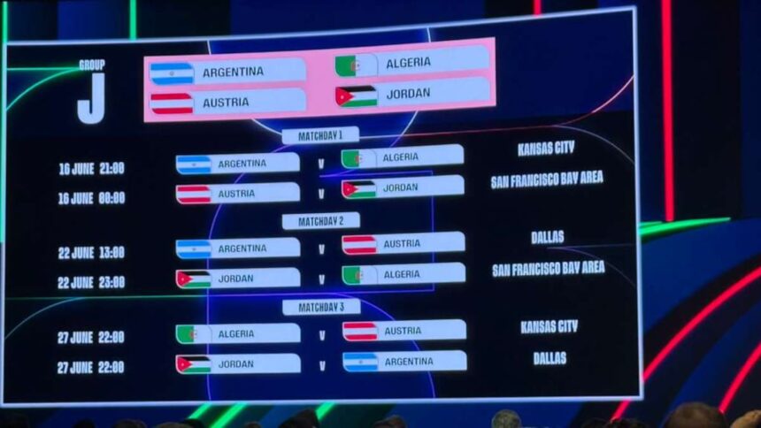 Quedó todo definido. La selección argentina ya conoce su camino en la fase de grupos del Mundial 2026: debutará el 16 de junio a las 22 (hora argentina) frente a Argelia, en Kansas City. Luego se medirá con Austria el 22 a las 14 en Dallas y cerrará su participación en el Grupo J el 27 a las 23 ante Jordania, también en Dallas.