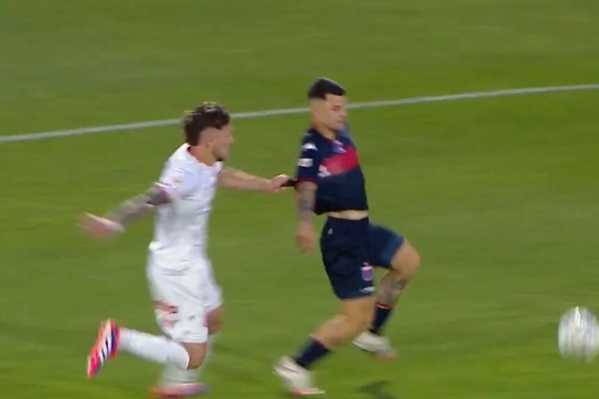 La gran controversia de la noche llegó a los 18 minutos, con el resultado 0-0. Joaquín Laso metió un pelotazo cruzado, a espaldas de los centrales. Nacho Russo picó habilitado, y Kevin Jappert, en un intento desesperado, tomó de la camiseta al delantero de Tigre, que cayó aparatosamente. Es posible que, por la velocidad de la jugada, Baliño no haya podido seguir de cerca la acción. Pero sí debió haberlo advertido Héctor Paletta, que estaba a cargo del VAR. En las imágenes de las repeticiones estaba claro el agarrón, se observó cómo quedaba estirada la casaca de Russo, y cómo el delantero perdía estabilidad. No hubo revisión, y no se cobró el penal que correspondía. “Yo creo que fue penal. Obviamente hay un poco de mí que me tiro, pero creo que es penal”, dijo el hijo del recordado Miguel después del encuentro.