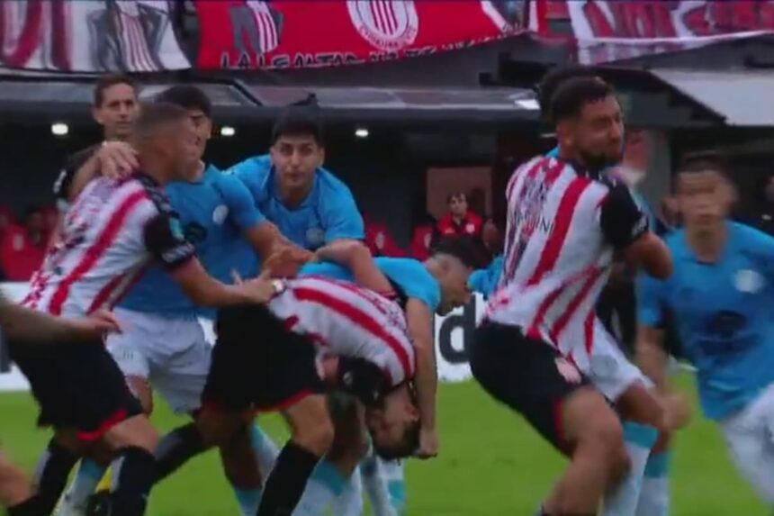 Pero en la misma acción que salvó Espínola hubo un tiro de esquina más para Belgrano y llegó una jugada insólita en el partido. Cuando el reloj marcaba 30 minutos, fue el envío al área y en un sector del área hubo un claro agarrón entre dos jugadores. Leandro Morales y Nicolas Capraro quedaron tendidos en el piso y la pelota salió otra vez al córner. Pero en ese momento el juez del partido Nicolás Lamolina detuvo la acción.