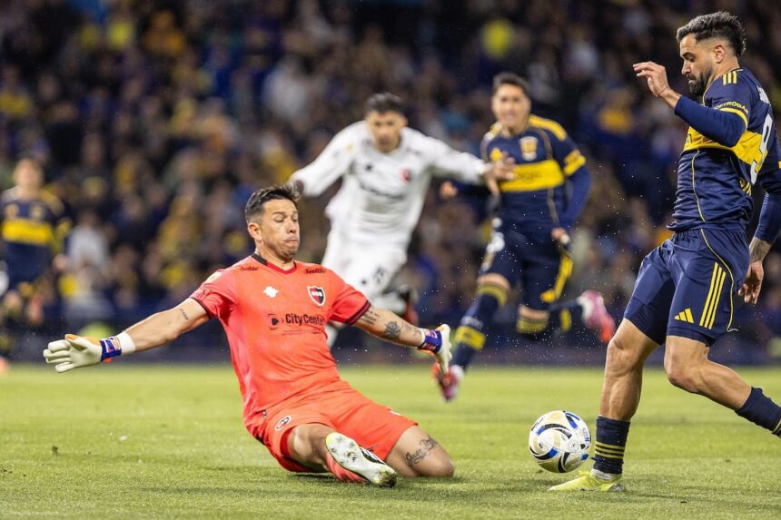 Boca hizo que los papeles de Newell’s se quemaran demasiado rápido. En la cuerda floja, Fabbiani modificó el esquema para visitar la Bombonera: sumó un zaguero -Noguera- para armar línea de cinco y sacrificó un punta -Benedetto-. Una decisión lógica, considerando el momento del equipo y el esquema de Boca, con doble 9 -Merentiel y Giménez- y dos volantes por afuera, Aguirre y Velasco. Pero Newell’s fue conservador solo en la intención, no en la ejecución. Quedó claro con el primer gol: Barinaga superó con facilidad a Montero y su centro al corazón del área encontró al ex Banfield libre para imponerse entre Lollo y Mosquera.