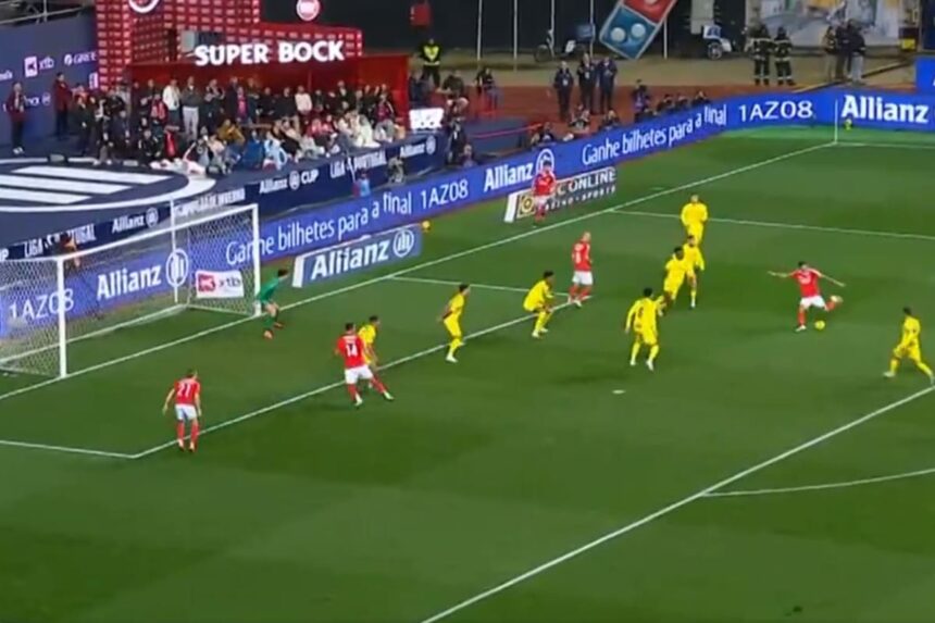 Poco tiempo le costó a Benfica convertirse en finalista, porque en 10 minutos hizo los tres tantos. El campeón del mundo en Qatar 2022 fue determinante en el duelo a partido único en el estadio Dr. Magalhães Pessoa, de la ciudad de Leiria. En el primer tanto, el ex atacante de Rosario Central anotó con una jugada propia de él.