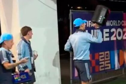 “Estoy acá para felicitarlos por su participación en el torneo, y a sus familias, compañeros y compañeras. Les dejo esta ofrenda con cosas de Argentina, algo blanco, algo azul (se ríen), y cosas de nuestra tierra que queremos compartir con ustedes. Muchas gracias”, se lo escucha a Montoya, antes de que todos aplaudan y el capitán de Los Pumas se abrace con Etzebeth.