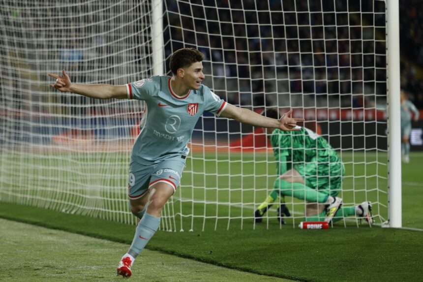 En una de las primeras acciones del partido, Atlético de Madrid contó con un córner desde la derecha. Griezmann tocó con De Paul y el argentino se la devolvió. El francés mandó el centro al área, que fue ganado en las alturas por Giuliano Simeone. La pelota fue directo al segundo palo y allí apareció Álvarez para empujarla a los 46 segundos, sorprendiendo a todo el público Blaugrana.