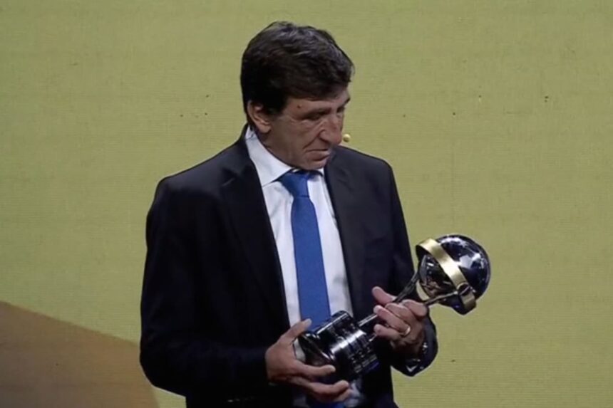 Alejandro Dominguez, presidente de la Conmebol, le entrega a Gustavo Costas una mini réplica de la Copa Sudamericana que ganó Racing en 2024DANIEL DUARTE – AFP