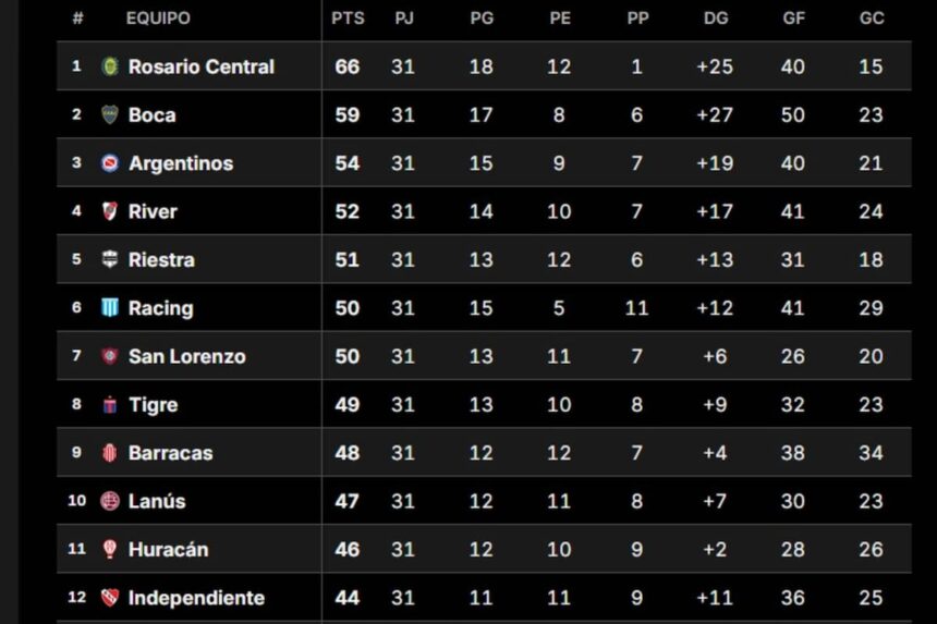 Segundo se ubicó Boca. El Xeneize (59), con su victoria en el Superclásico, ya no puede ser alcanzado por Argentinos Juniors (54), su perseguidor más cercano, menos aún por River (52), y Riestra (51).