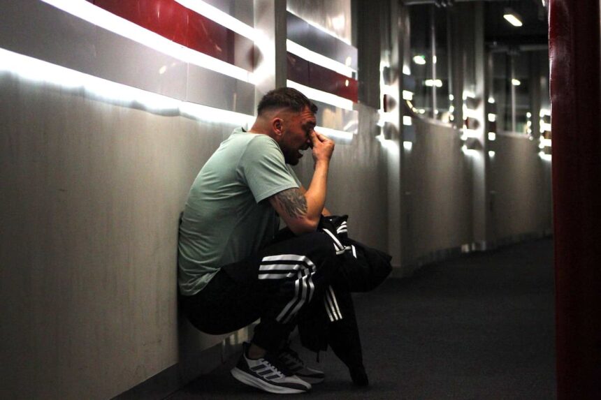 La postal emociona: Gustavo Benítez, el técnico de Deportivo Riestra, sentado en el anillo del Monumental, llorando en silencio después de que su equipo escribiera la página más gloriosa de su joven paso por Primera División.