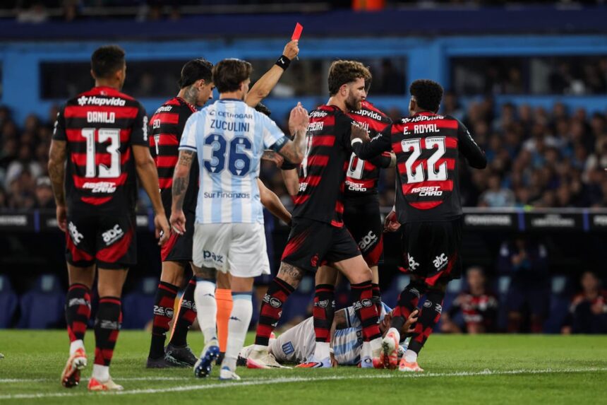 Cabe recordar que al ecuatoriano ya lo habían echado ante Estudiantes, en la ida de los cuartos de final que Flamengo le ganó por 2-1. Aquella vez, equivocadamente: punteó una pelota antes de que Facundo Rodríguez la despejara en el área, el árbitro observó la suela levantada para meter la plancha y decidió sacarle la tarjeta amarilla. Como ya tenía una, se fue expulsado, sin posibilidad de que el VAR corrigiera a Andrés Rojas, el árbitro de aquella noche.