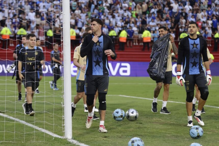 Cerca de las 17, los “titulares” de la selección mayor salen a calentar. Hacen dos pasadas de calentamiento, a un ritmo lento. Parecen vueltas olímpicos, porque todos saludan, todos devuelven el cariño de la gente en Parque Patricios. En la primera línea del grupo, los generales de la victoria qatarí: esta el Dibu, claro, con sus guantes rojos. Está De Paul, y es un indicio de que no tiene problemas físicos. Está Nicolás Otamendi, el emblema de la defensa. Está Cristian “Cuti” Romero, el mariscal. También, Germán Pezzella (bahiense, claro) y Nahuel Molina. Falta el comandante en jefe, ausente con aviso. Falta Lionel Andrés Messi, pero es como si estuviera presente.