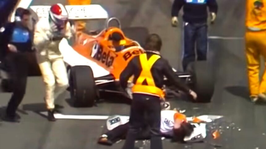 Un par de segundos después del choque entre los Arrows se ve al mecánico Dave Luckett tirado sobre el asfalto