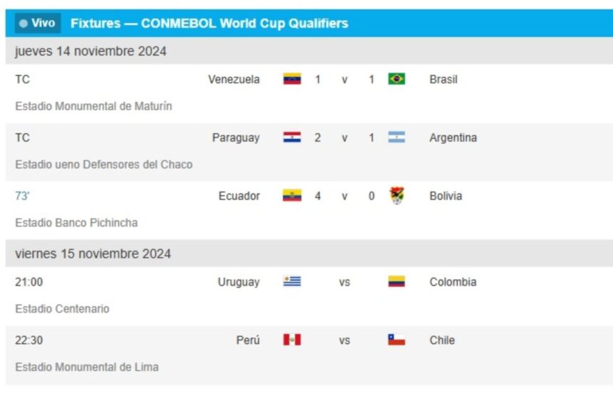 En el primer partido del día, Venezuela y Brasil igualaron 1-1 en Maturín. Raphinha abrió la cuenta para la Canarinha con un potente tiro libre sobre el final del primer tiempo; lo empató Telasco Segovia con un bombazo, y poco después Rafael Romo, el arquero de la Vinotinto, se lució al atajarle un penal a Vinicius Jr; el local terminó con diez por la expulsión de Alexander González. Así, Venezuela mantiene el invicto como local, pero lleva siete fechas sin triunfos.