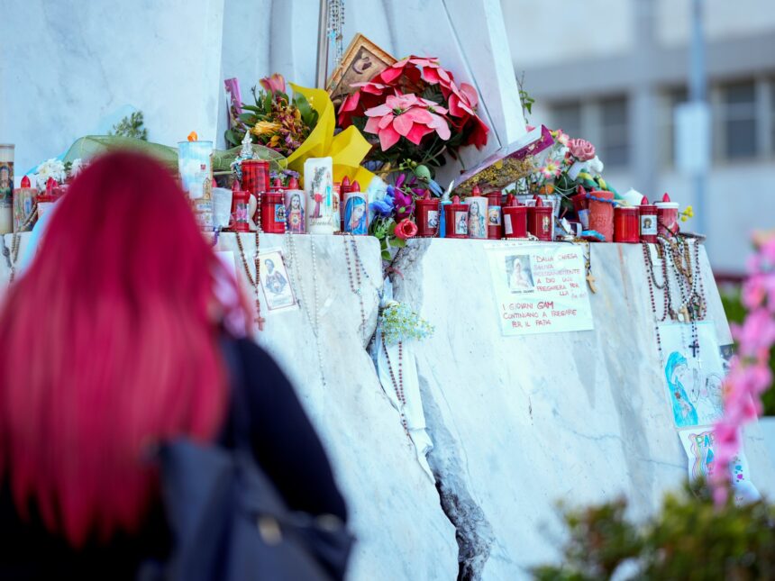 Flores, velas y mensajes para el Papa en las puertas del hospital Gemelli. Foto: APFlores, velas y mensajes para el Papa en las puertas del hospital Gemelli. Foto: AP