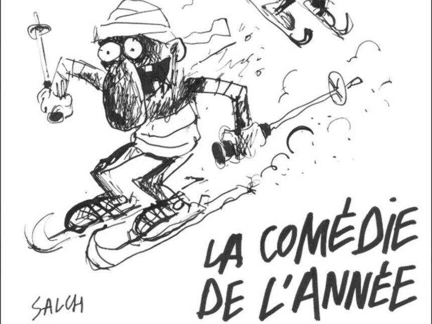 La ilustración muestra a dos esquiadores con el lema «Los quemados van a esquiar» y, debajo, «Comedia del año», en referencia a la película cómica «Les Bronzés font du ski» (Los bronceados van a esquiar).