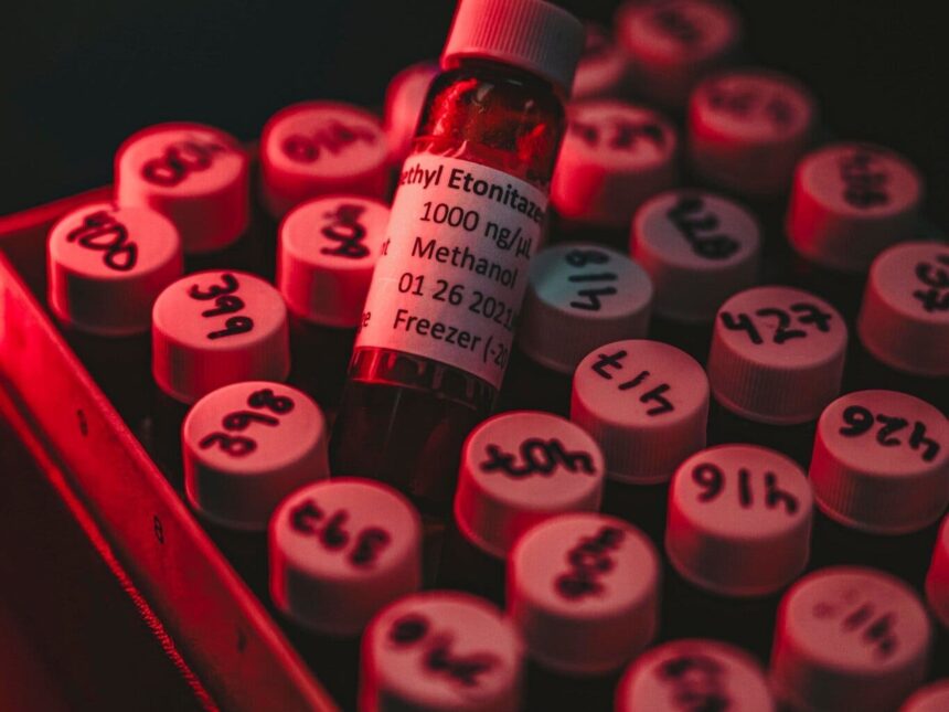 Metonitazeno, un nitazeno altamente potente vinculado a sobredosis fatales; viales en el Centro de Investigación y Educación en Ciencias Forenses. Foto: The New York Times.Estas sustancias parecían seguir un patrón conocido desde el laboratorio hasta la calle. La familia de drogas nitazeno fue desarrollada a finales de la década de 1950 por la farmacéutica suiza Ciba, cuyo plantel científico esperaba haber encontrado un nuevo analgésico. Sin embargo, en los primeros experimentos los nitazenos suprimieron peligrosamente la respiración, de manera que, como muchos fármacos con efectos secundarios inaceptables, prácticamente desaparecieron, y sus estructuras químicas y sus efectos difícilmente se conocieron más allá de algunas patentes alemanas viejas.