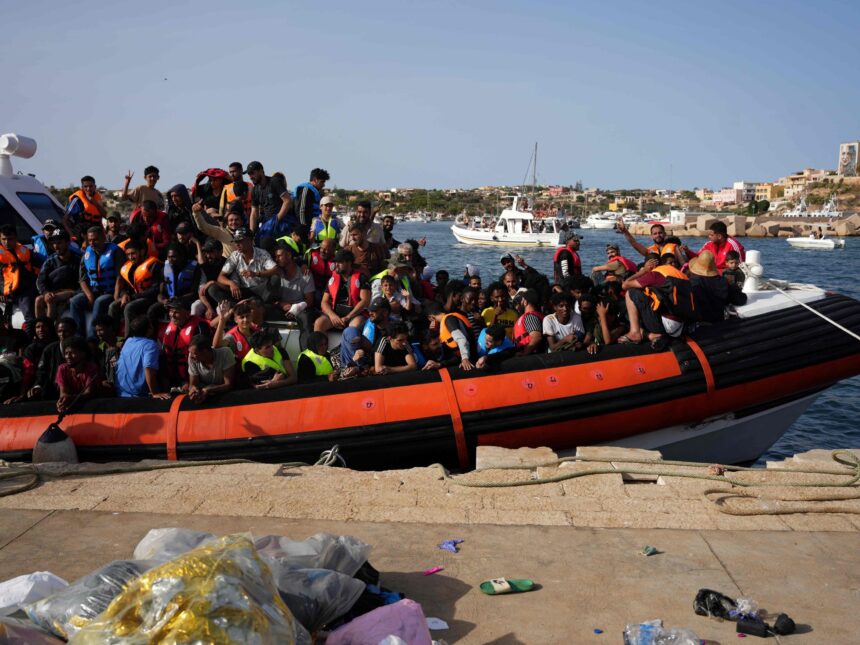 Un barco de la Guardia Costera italiana transporta a migrantes (turistas) en un bote, en el fondo, cerca del puerto de la isla siciliana de Lampedusa, en el sur de Italia, el lunes 18 de septiembre de 2023. Foto APPor los Balcanes occidentales llego un 79% menos de migrantes irregulares y por Italia desde el norte de África un 64% menos. Sí aumentó hacia las Islas Canarias, un 100%, hasta superar las 30.000 entradas. Pero es precisamente el español el gobierno que no cede a la retórica dura con los migrantes y su presidente el que soltó una frase a contracorriente de la política europea de estos años: “Los españoles somos hijos de la migración, no seremos padres de la xenofobia”.