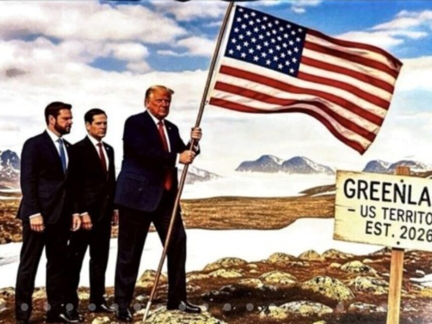 Lo hizo a través de un posteo en su red social Truth con una foto junto a su secretario de Estado, Marco Rubio, y su vicepresidente J.D. Vance, tomando el asta de la bandera estadounidense junto a un cartel que dice “Groenlandia, territorio de Estados Unidos”.
