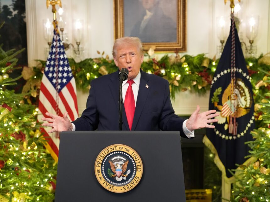 El presidente pronunció el discurso desde el Salón Diplomático, flanqueado por árboles de Navidad. Sus principales asesores lo observaron desde el interior de la sala.