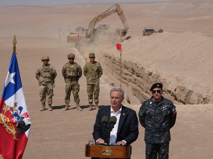 El presidente José Antonio Kast lanzó el lunes su “Plan Escudo Fronterizo” durante una visita a la frontera norte de Chile, una de las principales puertas de entrada al país, donde acompañó los primeros trabajos para la construcción de una zanja y la instalación de otras barreras físicas para frenar la inmigración ilegal en el marco de su gobierno de emergencia.