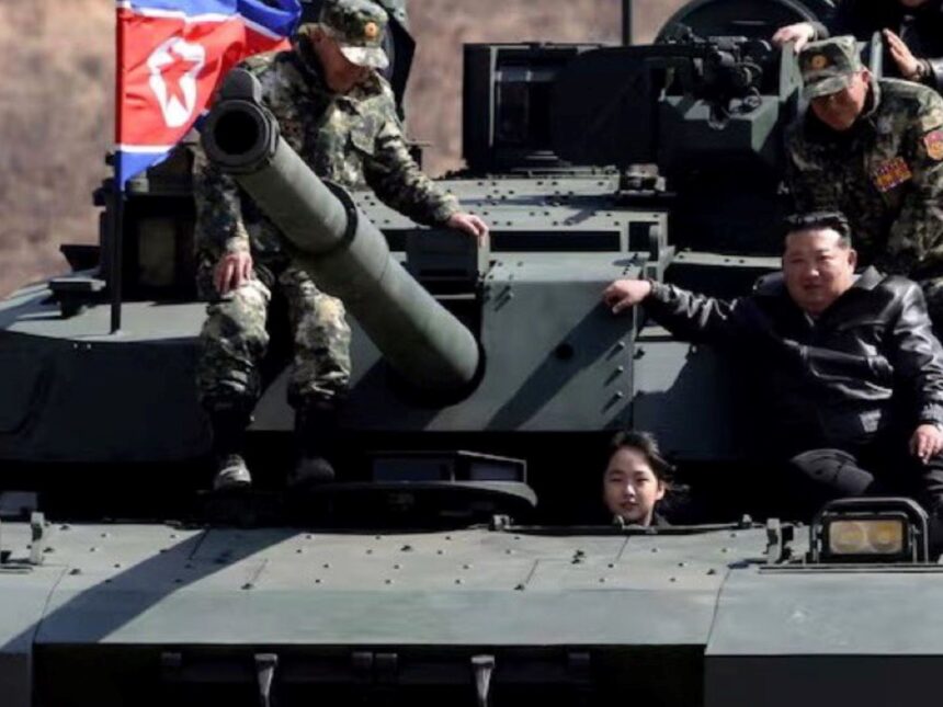 Solo que, en este caso, la niña está al mando de un enorme tanque de guerra, con la cabeza asomando por la escotilla del conductor, mientras el padre —el líder norcoreano Kim Jong Un— se recuesta en el casco detrás de ella.