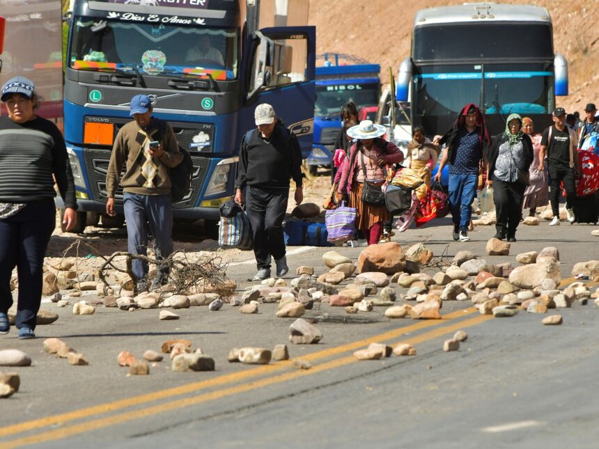 Las personas caminan con sus equipajes durante la segunda jornada de bloqueos por seguidores del expresidente Evo Morales (2006-2019). Foto EFEEl exgobernante debía declarar el jueves ante la Fiscalía de la región sureña de Tarija, donde supuestamente ocurrieron los hechos, sin embargo, no acudió y su defensa presentó una excusa legal.