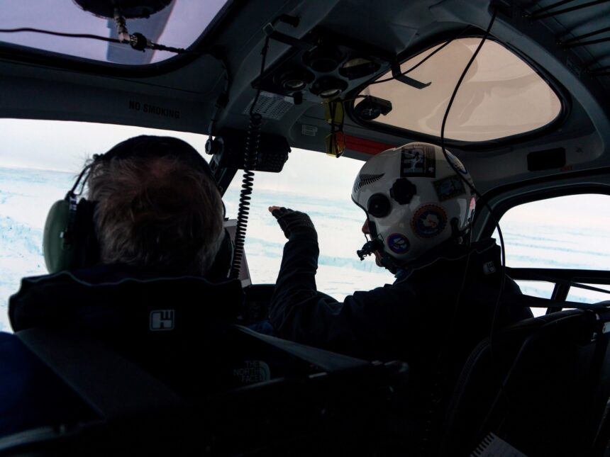 La tripulación de un helicóptero se prepara para despegar del rompehielos Araon durante un breve periodo de cielo despejado el domingo 11 de enero de 2026, para explorar un posible lugar de acampada para científicos en el glaciar Thwaites, en la Antártida. (Chang W. Lee/The New York Times)En cuestión de minutos, O’Rourke había dado la vuelta al helicóptero.