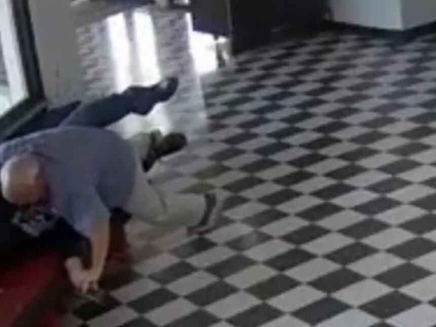 Es el momento en que Moore entra en escena. Sale por una puerta, empuja al agresor contra un banco y lo retiene en el suelo antes de que otro hombre interviniera y alejara el revolver de una patada.