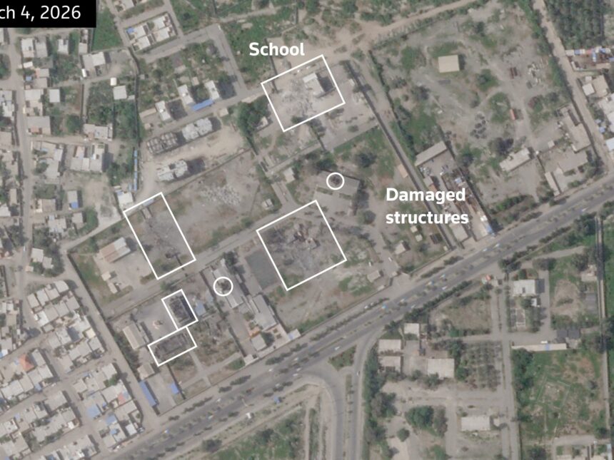 Un conjunto de pruebas recopiladas por The Times , que incluye imágenes satelitales, publicaciones en redes sociales y otros videos verificados, indica que el edificio de la escuela primaria Shajarah Tayyebeh sufrió graves daños por un ataque de precisión que se produjo simultáneamente con los ataques a la base naval. La base está operada por el Cuerpo de la Guardia Revolucionaria Islámica.
