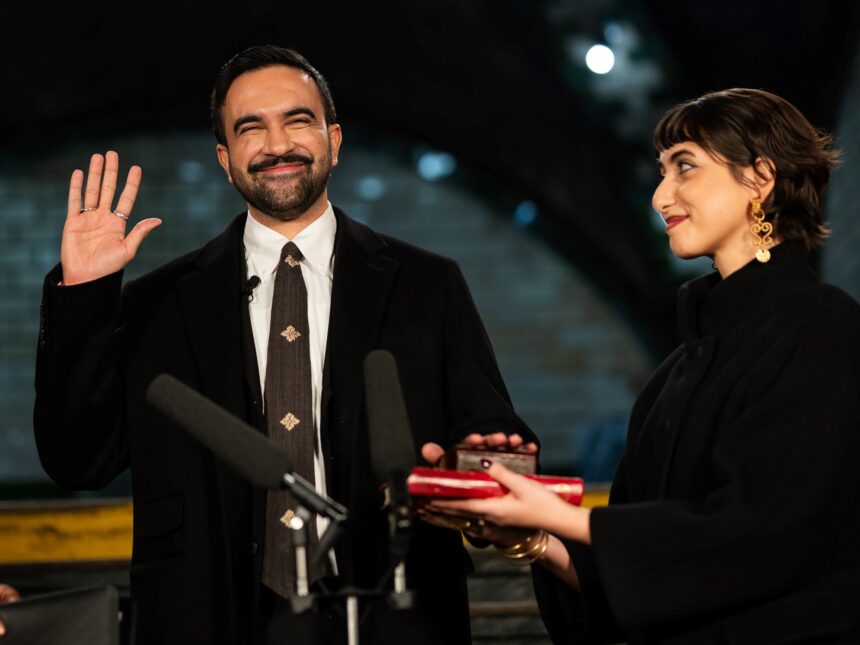 Y finalmente, después de una cuenta regresiva improvisada hasta la medianoche y gritos de «Feliz Año Nuevo», Mamdani colocó su mano izquierda sobre dos Coránes que sostenía su esposa, levantó la mano derecha y recitó el juramento del cargo (un Corán pertenecía a su abuelo, el otro a Arturo Schomburg, un historiador y escritor negro).