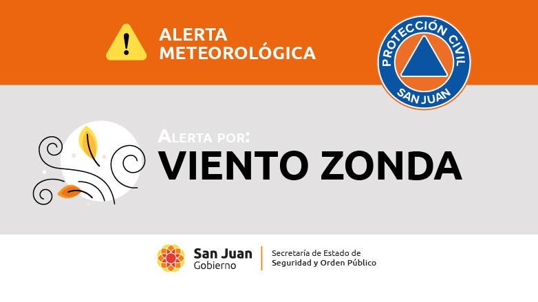 La Dirección de Protección Civil informa que, durante la tarde y noche de este domingo 16 de junio, se prevé la ocurrencia de viento Zonda en el sector de Precordillera de Calingasta, Pocito, Rivadavia, Sarmiento, Ullúm y Zonda.