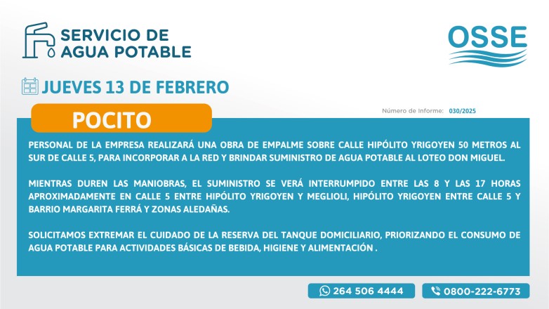 Obras Sanitarias informa que este jueves 13 de febrero de 2025, llevará a cabo una obra de empalme sobre calle Hipólito Yrigoyen 50 metros al sur de Calle 5, para incorporar a la red y brindar suministro de agua potable al Loteo Don Miguel, en el departamento Pocito.