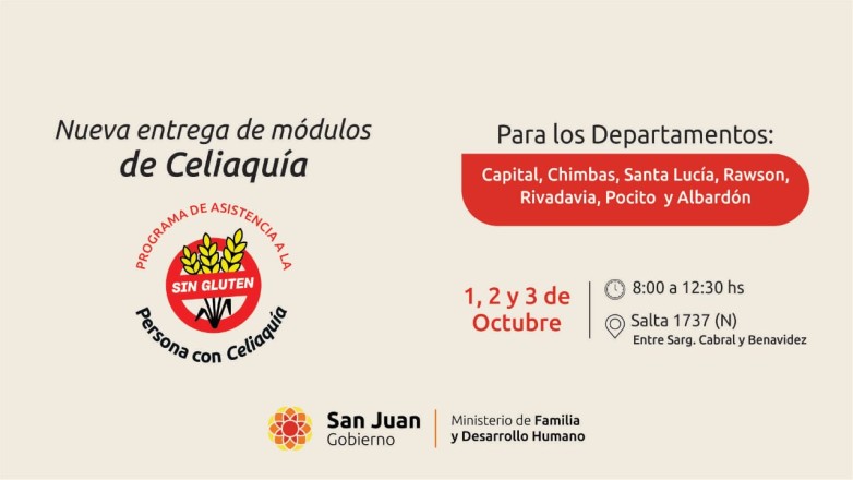 La Dirección de Emergencia y Políticas Alimentarias, dependiente del Ministerio de Familia y Desarrollo Humano, informa a la comunidad sobre un cambio de lugar en la entrega de módulos alimentarios para personas con celiaquía.