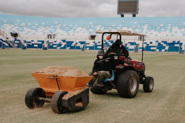 En el Estadio del Bicentenario, uno de los trabajos más importantes es la preparación del campo de juego para el partido de Los Pumas. Esta tarea demanda planificación, tiempo y precisión técnica. Primero se realiza el corte del césped existente para dejar la superficie en condiciones. Luego se aplica la semilla Meridian Gold, adecuada para reforzar la cobertura vegetal del campo. Posteriormente, se incorpora arena, lo que permite mejorar el asentamiento de la semilla, nivelar la superficie y favorecer el desarrollo del nuevo césped.
