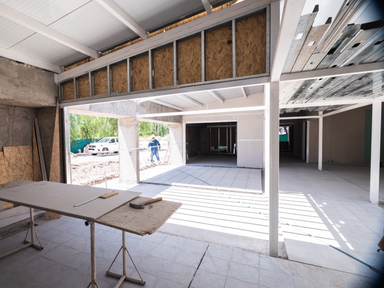 El sistema constructivo es mixto, combinando estructura metálica sobre platea de hormigón armado y panelería liviana con aislación térmica, lo que permite una obra más eficiente y adecuada a las condiciones del entorno.