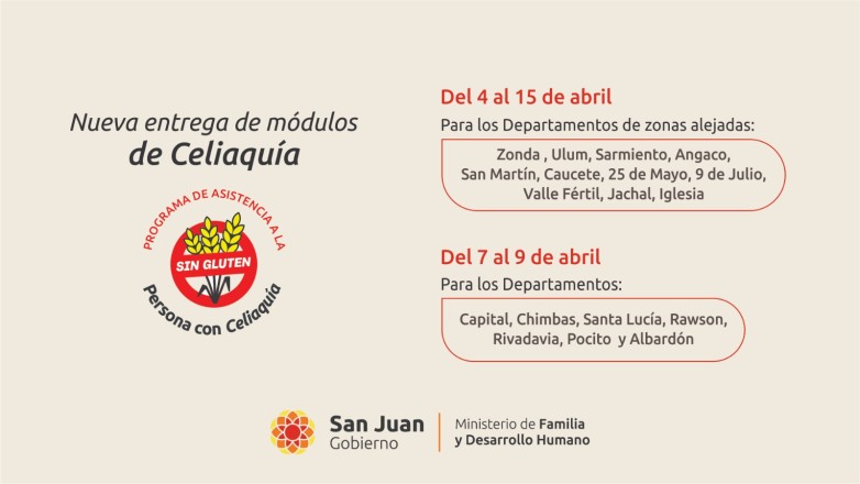 El Ministerio de Familia y Desarrollo Humano informa las fechas y lugares para la distribución de módulos alimentarios destinados a personas celíacas en el Gran San Juan y áreas alejadas. Este programa busca garantizar el acceso a alimentos aptos para celíacos.