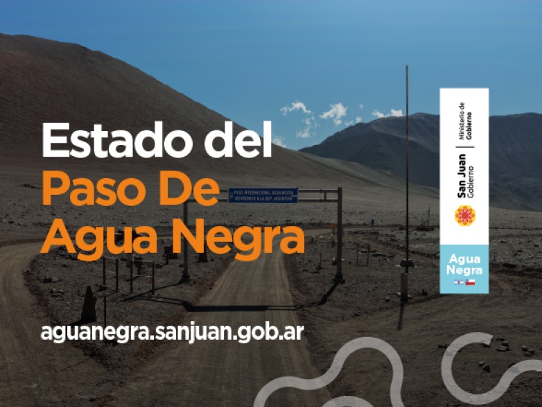 El Ministerio de Gobierno, a través de la Secretaría de Relaciones Institucionales, informa que el Paso Internacional por Agua Negra, Ruta Nacional 150, se encuentra Habilitado para circular de 08:00 a 16:00 hs.