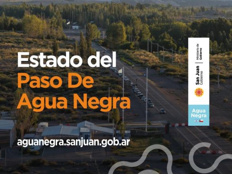 El Ministerio de Gobierno, a través de la Secretaría de Relaciones Institucionales, informa que el Paso Internacional por Agua Negra, Ruta Nacional 150, se encuentra Habilitado para circular de 07:00 a 17:00 hs.