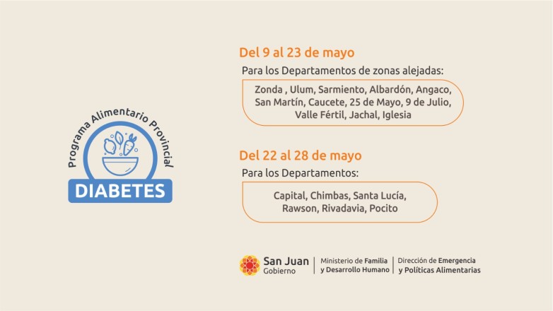 Gran San Juan: a partir del 22 al 28 de mayo de 2025, comenzará la distribución de los módulos alimentarios especialmente diseñados para personas con diabetes en el Gran San Juan. Los beneficiarios deberán presentarse en el depósito del Ministerio de Familia y Desarrollo Humano, ubicado en la calle Salta 1724 (norte), entre Sargento Cabral y Benavidez, en el horario de 8:00 a 13:00 horas.