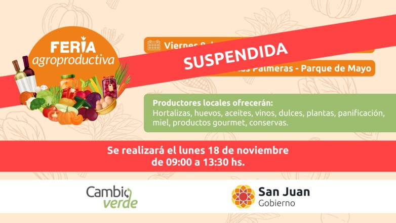 El próximo lunes 18 de noviembre, alrededor de 120 emprendedores y productos proveniente de todos los departamentos de la provincia se lleva a cabo una nueva edición de la Gran Feria Agroproductiva desde las 9 a 13.30 h. en el Paseo de las Palmeras del Parque de Mayo. El cambio de fecha se debe al viento con fuertes ráfagas, previsto para este sábado 16 de noviembre, que azotará la provincia.