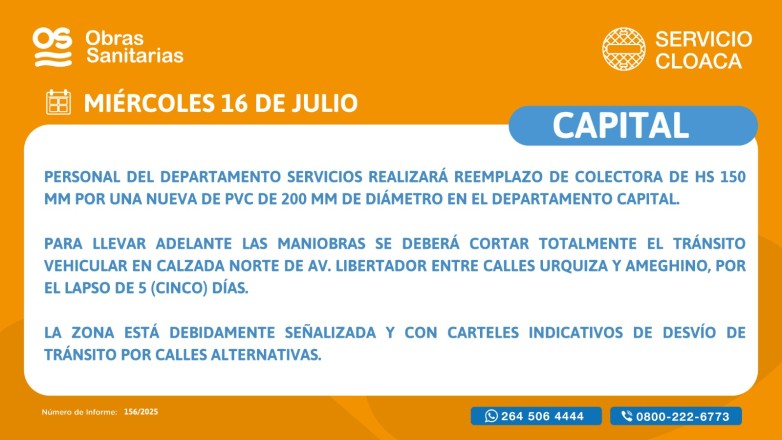 Personal del Departamento Servicios de Obras Sanitarias programó reemplazo de colectora de HS 150mm por una nueva de PVC de 200 mm de diámetro en el departamento Capital.