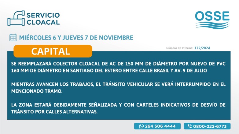 Obras Sanitarias programó maniobras de reemplazo de colector cloacal en Santiago del Estero entre calle Brasil y Av. 9 de Julio. Las tareas iniciarán este miércoles 6 de noviembre y se prevé que se extiendan hasta el jueves 7 de noviembre, viéndose interrumpido por completo la circulación del tránsito vehicular.
