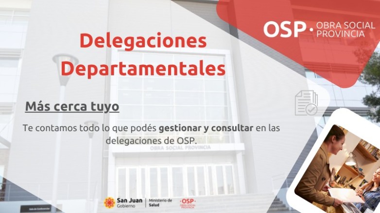 Las delegaciones son un punto de contacto cercano, pensado para brindar atención personalizada y eficiente en cada rincón de la provincia. En el siguiente link a la página web de OSP se encuentra la dirección, teléfono y horario de atención de cada una de las delegaciones departamentales: https://obrasocial.sanjuan.gob.ar/?servicio=Servicios&subcategoria=Delegaci%C3%B3n