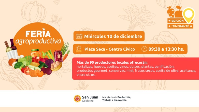 La Feria Agroproductiva vuelve a escena, pero esta oportunidad, será el miércoles 10 de diciembre en la Plaza Seca del Centro Cívico. Más de 90 productores locales, quienes pondrán a disposición del público una amplia variedad de productos: verduras, huevos, panificados, miel, conservas, frutos secos, dulces, aceite de oliva, aceitunas, entre otros.