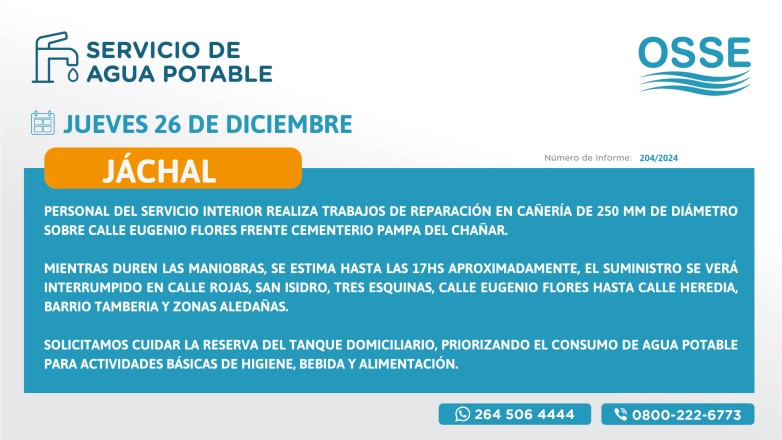 Mientras duren las maniobras, se estima hasta las 17hs aproximadamente, el suministro se verá interrumpido en Calle rojas, San Isidro, Tres esquinas, calle Eugenio Flores hasta calle Heredia, barrio Tamberia y zonas aledañas