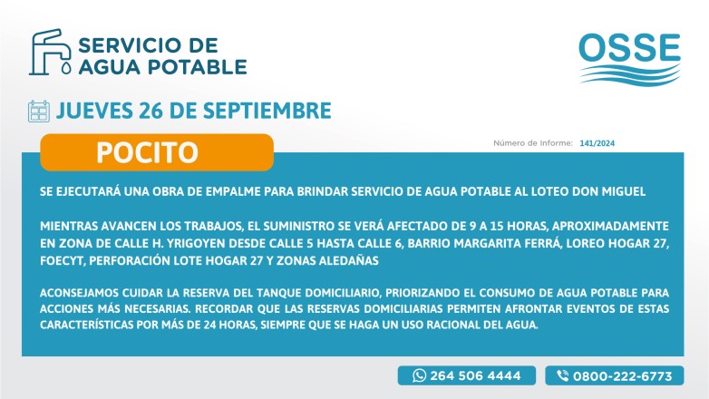 Obras Sanitarias informa que este jueves 26 de septiembre, llevará a cabo una obra de empalme para incorporar a la red y brindar suministro de agua potable al Loteo Don Miguel en el Departamento de Pocito.