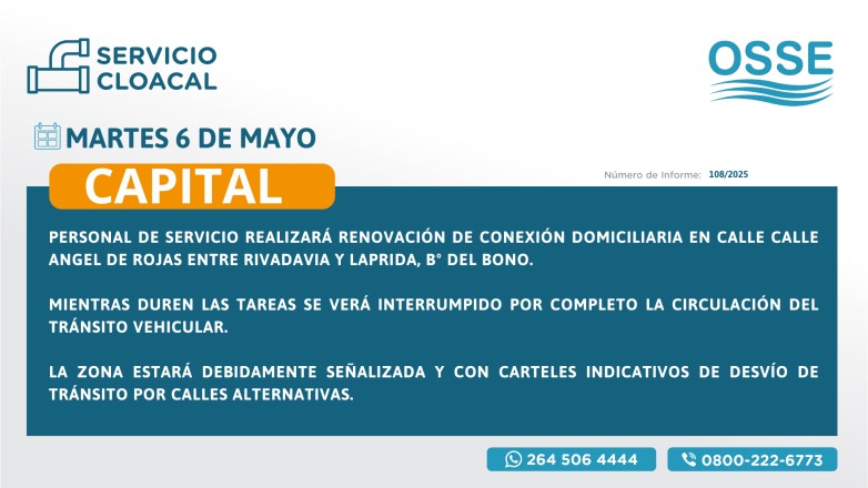 Obras Sanitarias programó maniobras de reemplazo de colector cloacal en calle Angel de Rojas entre Rivadavia y Laprida, barrio del Bono. Las tareas se ejecutarán durante este martes 6 de mayo y se extenderán hasta el sábado 10 de mayo inclusive, viéndose interrumpido por completo la circulación del tránsito vehicular.