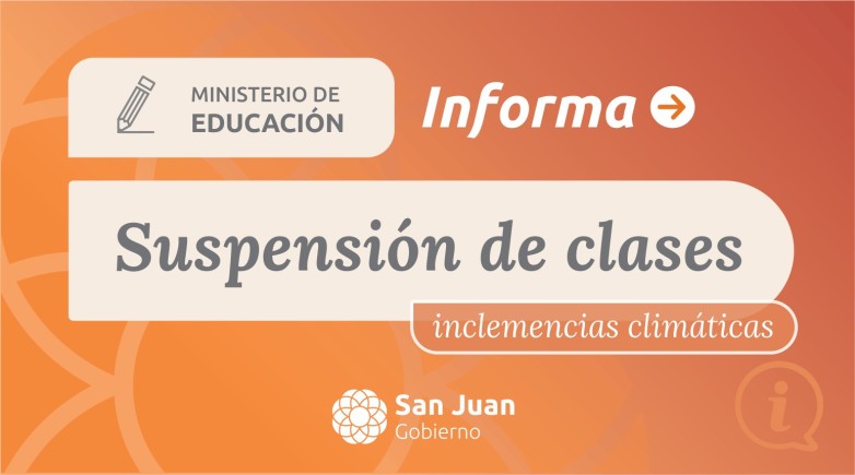 Ante el alerta emitido por el Servicio Meteorológico Nacional y por recomendación de Protección Civil de la Provincia, que informó que durante la jornada se prevé la ocurrencia de viento Zonda -Alerta Naranja- en todo el territorio provincial; el Ministerio de Educación informa que se suspende la actividad escolar para la tarde de este jueves 19 de septiembre.