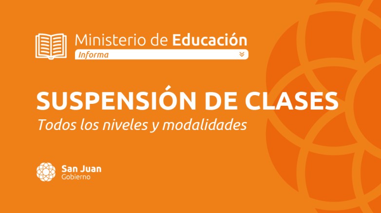 Ante el alerta meteorológica por vientos emitido por el Servicio Meteorológico Nacional y por recomendación de Protección Civil de la provincia, el Ministerio de Educación informa que se suspende la actividad escolar este viernes 31 de octubre en los departamentos Jáchal, Iglesia y Calingasta.