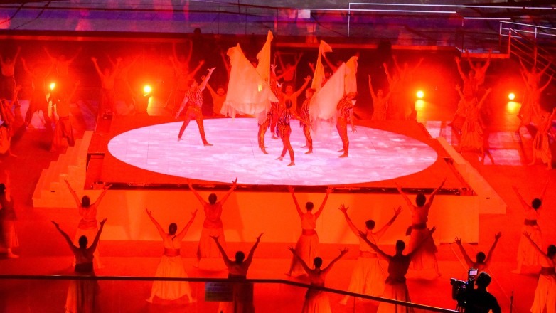 “Todo comenzó con una chispa”, con esa primera frase encendió el escenario en un acto lleno de simbolismo. Imágenes en blanco y negro de históricos ciclistas y jockeys sanjuaninos cobraron vida en la pista, mientras los bailarines, como llamas danzantes en trajes de vivos colores flúor, se movían con energía por toda la pista del velódromo. El fuego que nacía y envolvía todo, en una explosión de fuerza y luz.