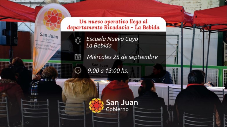 El Ministerio de Familia y Desarrollo Humano, en conjunto con diversos ministerios, llevará a cabo el decimonoveno operativo integral en el departamento de Rivadavia, este miércoles 25 de septiembre, de 9 a 13, en la Escuela Nuevo Cuyo de la localidad de La Bebida.